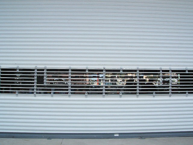 Cortina metálica enrollable marca CAFSA modelo e24-P de lámina galvanizada con pintura horneada en calibre 24, acabada en color blanco o gris, diseño de tira curva ocn perforaciones tipo mirillas de 2.5cm X 6cm incluye batiente y guías en color negro, con sistema de levantamiento en forma manual o eléctrica.