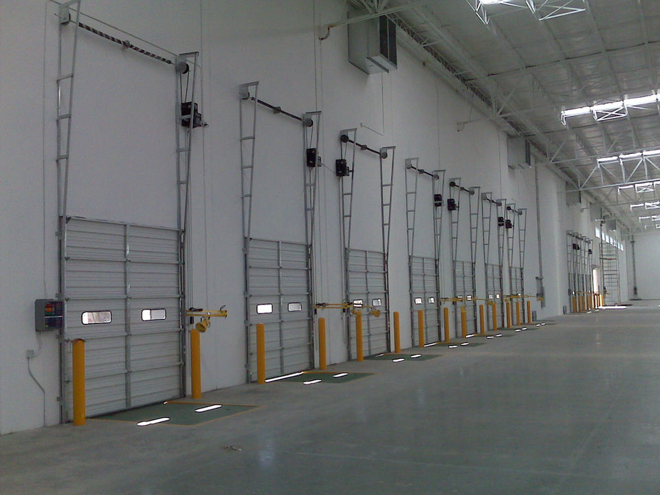 Puerta seccional metálica de lámina galvanizada, hueca o insulada calibre 24 o 25, con pintura horneada, acabado en color blanco, guías de 2" con sistema de levantamiento de operación ascendente vertical lift o high lift de levantamiento de forma manual o eléctrica.